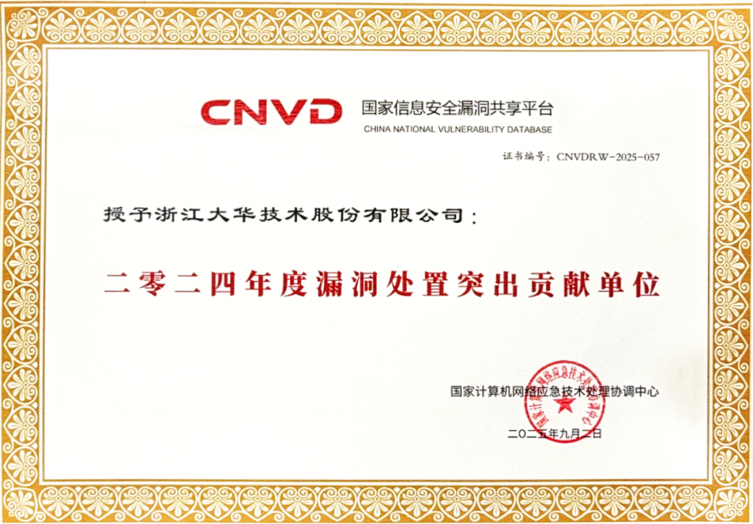 在昆明会场,由国家计算机网络应急技术处理协调中心(CNCERT)主办的第22届中国网络安全年会召开。CNCERT对2024年度优秀单位和个人进行表彰,大华股份凭借在漏洞治理领域持续深耕与突出成果,连续第五年获评“CNVD 漏洞处置突出贡献单位”称号。