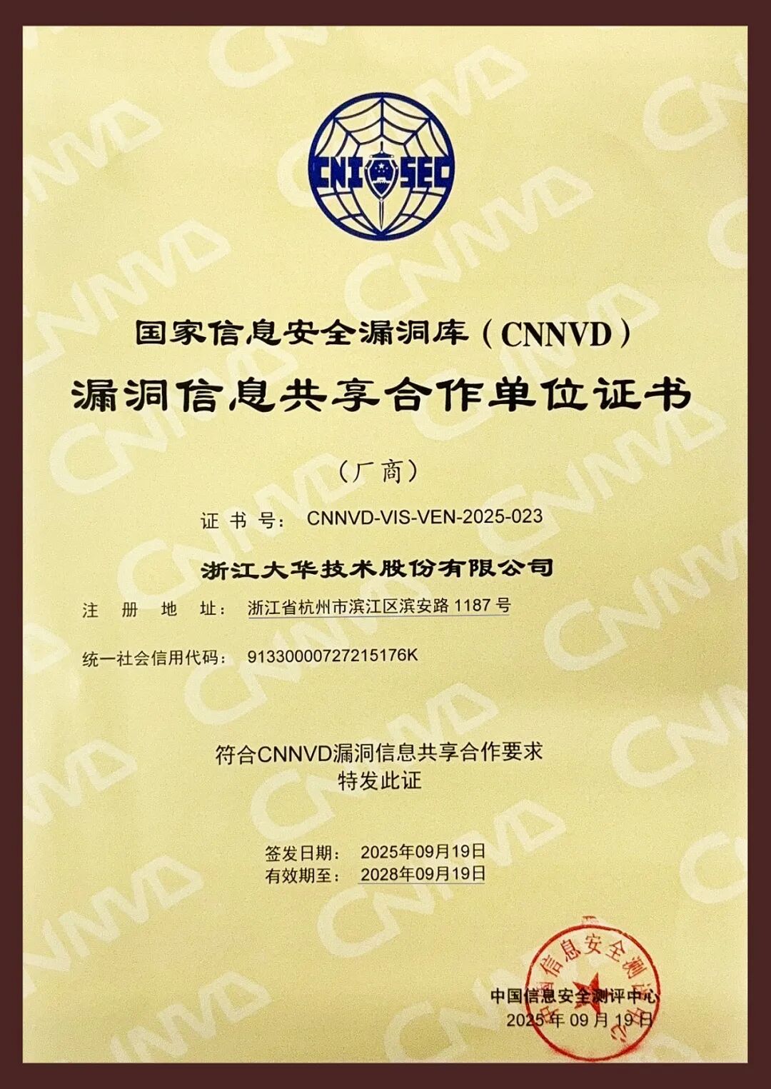 在成都会场,由中国信息安全测评中心(CNITSEC)指导,国家信息安全漏洞库(CNNVD)主办的基础软硬件产品漏洞治理生态大会召开。大华股份凭借在漏洞治理方面的优秀实践,荣获“2025 年度协同软硬件漏洞管理优秀企业”称号,并被授予“国家信息安全漏洞库(CNNVD)漏洞信息共享合作单位”证书。